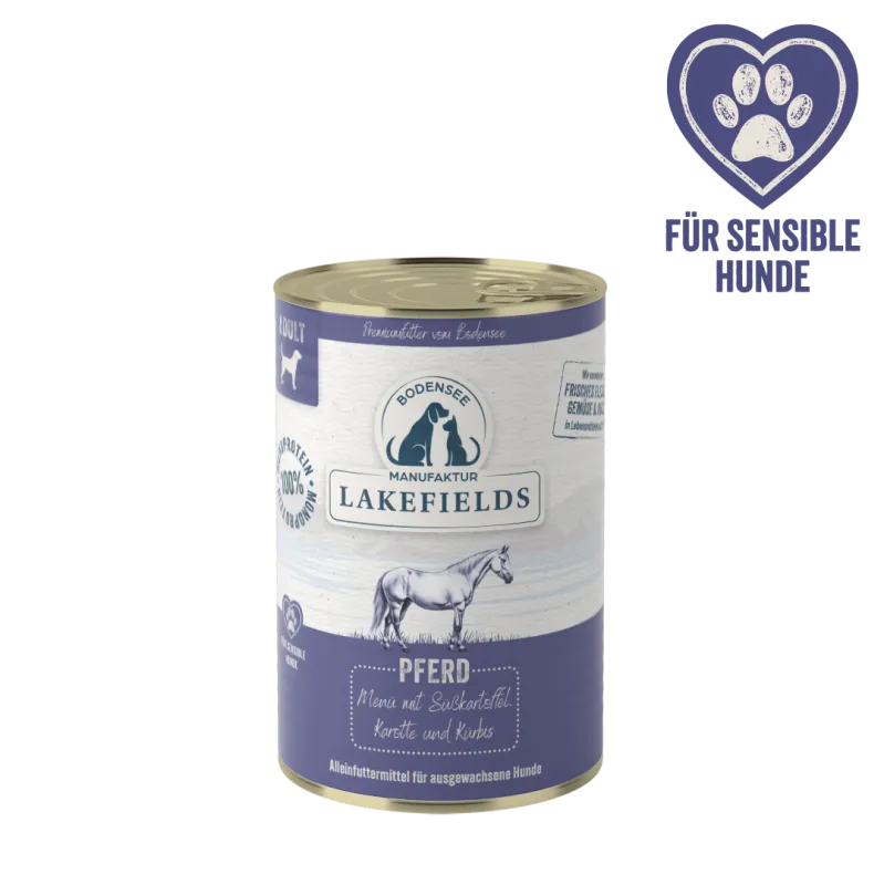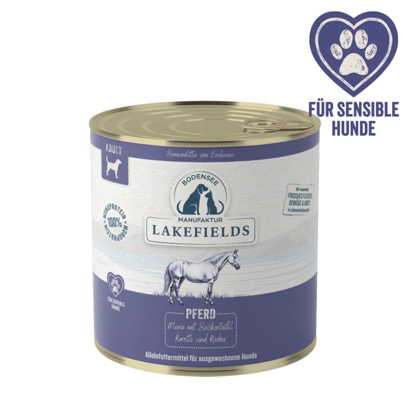 Das Lakefields Nassfutter-Menü Pferd mit Süßkartoffel eignet sich besonders für ernährungssensible Hunde. Pferd als ausgewählte tierische Proteinquelle wird häufig bei Futtermittelunverträglichkeiten eingesetzt und bietet eine gut verträgliche Alternative zu gängigen Fleischsorten. Die getreidefreie Rezeptur mit Süßkartoffel als bekömmlicher Kohlenhydratquelle sowie einer bewusst reduzierten, klar deklarierten Zutatenliste unterstützt eine ausgewogene und verträgliche Ernährung – ideal für Hunde mit sensibler Verdauung.