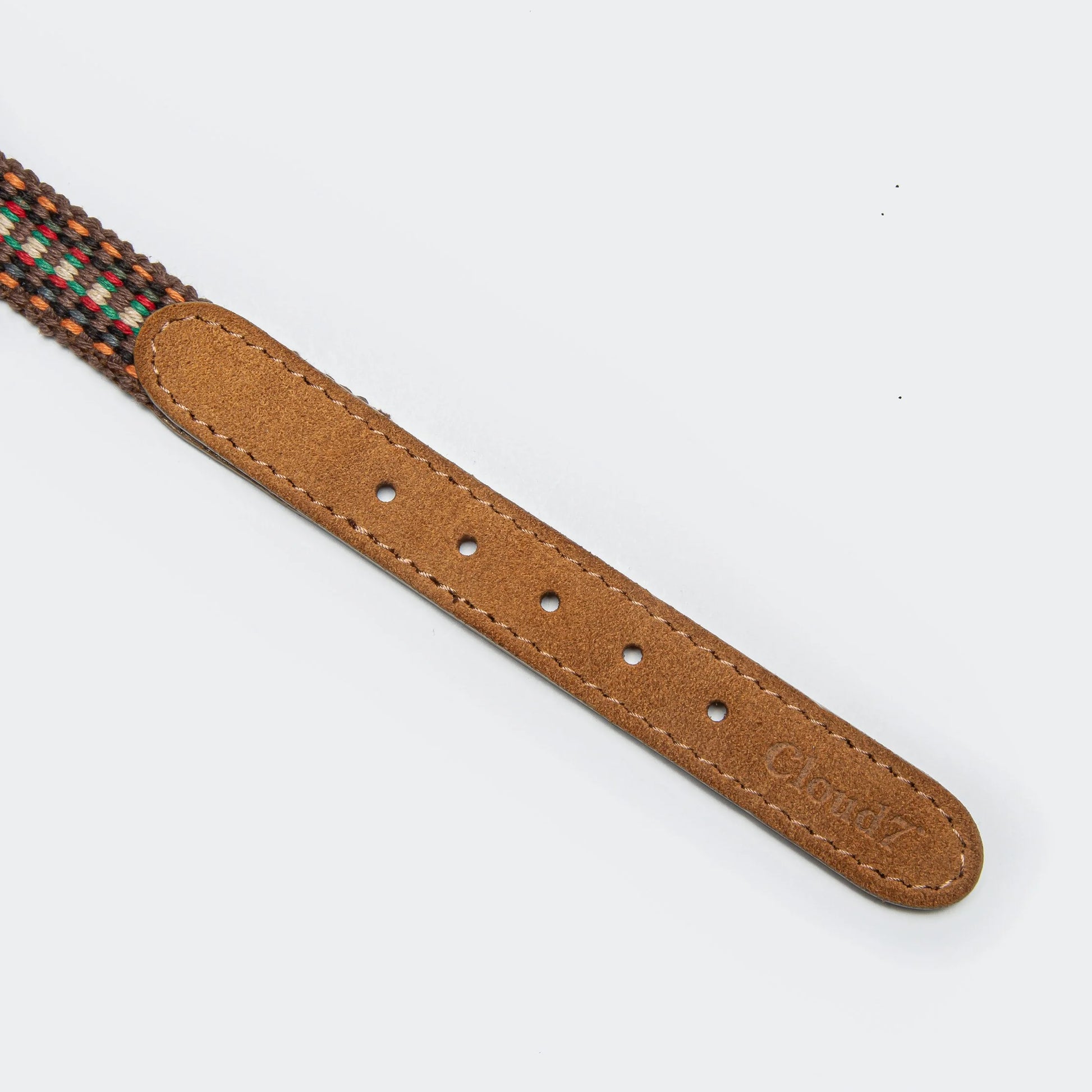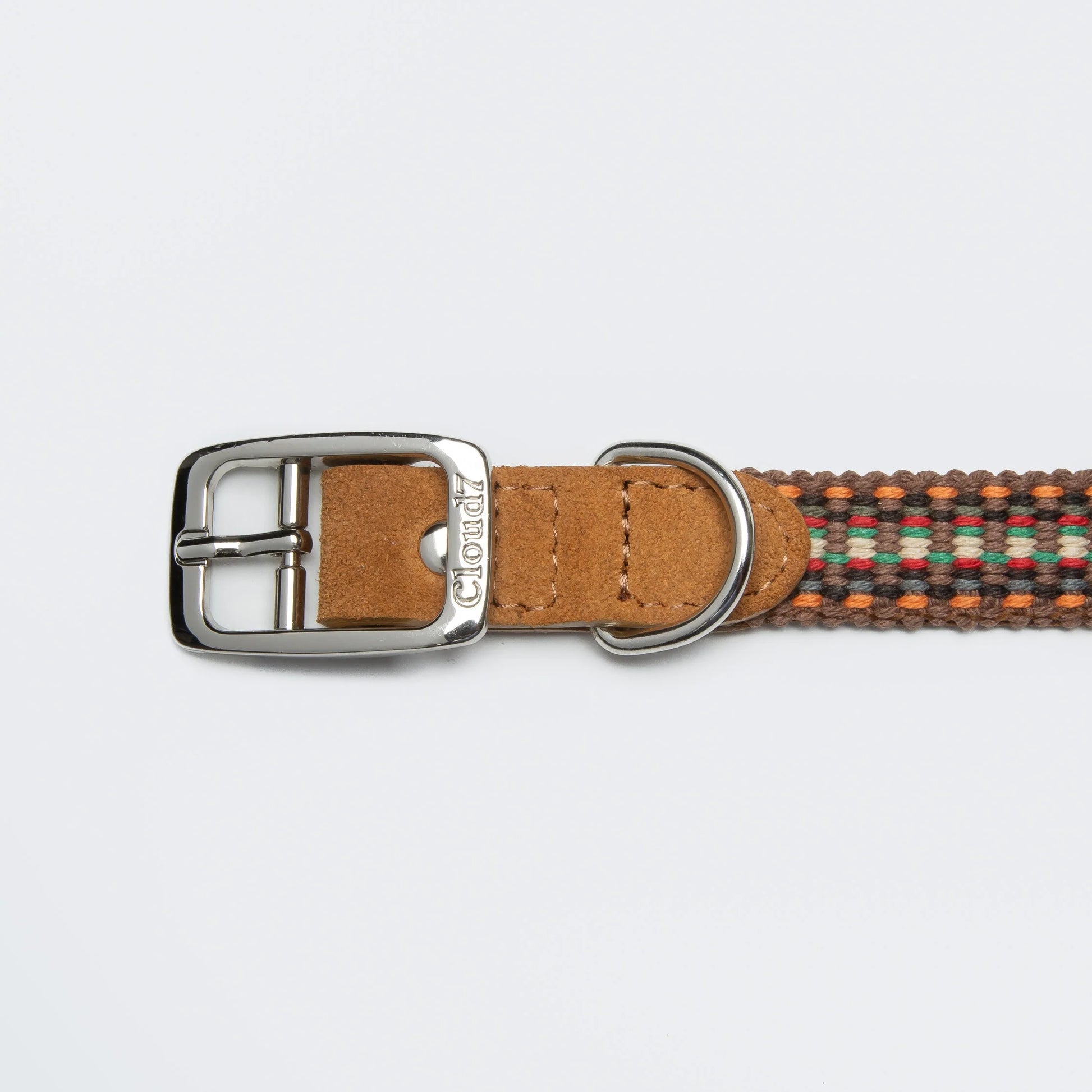 Hundehalsband aus strukturiertem Stoffband in Orange-Braun-Weiß gemustertem Ethno-Look, vollendet mit elegantem braunen Wildleder.