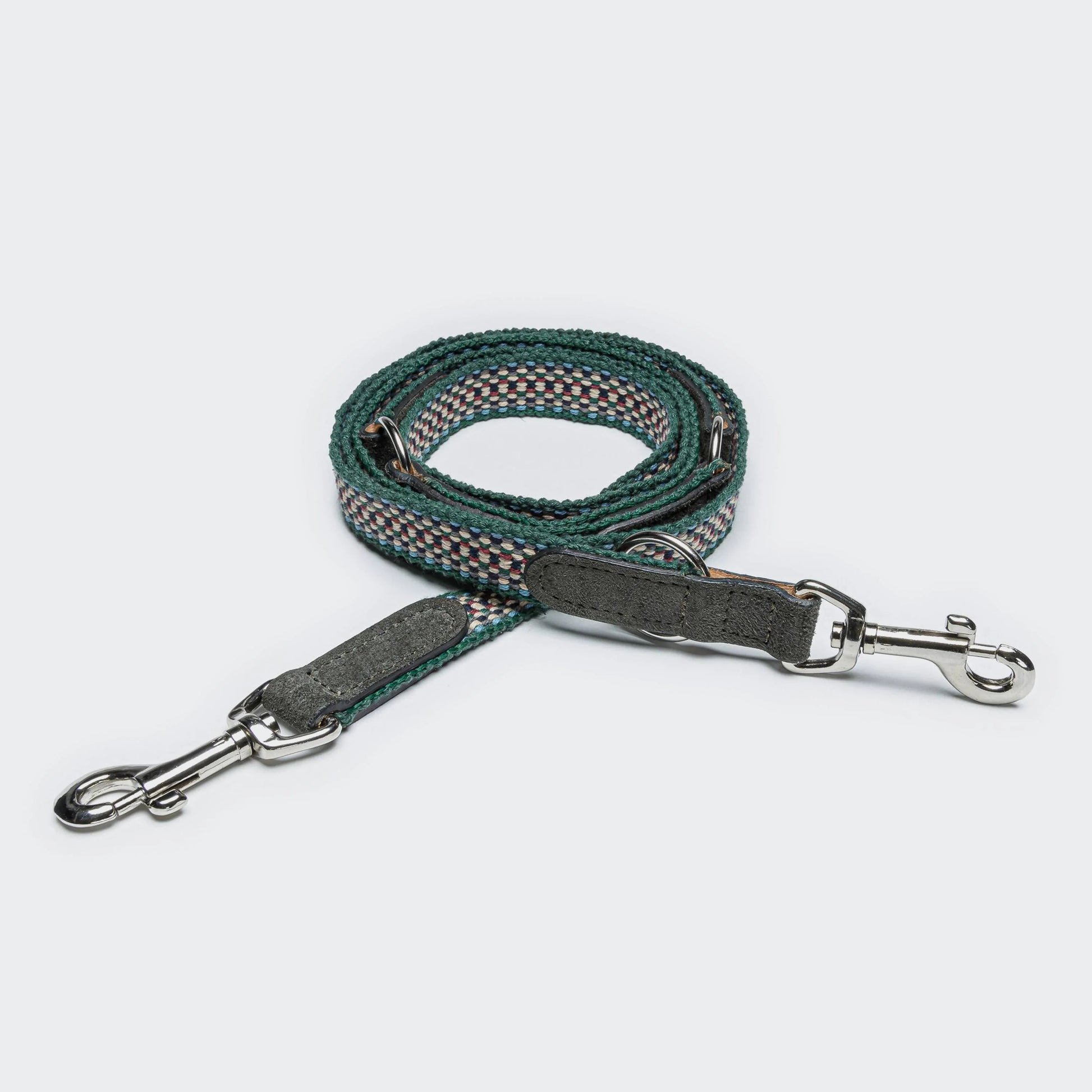 Hundeleine mit variabler Länge aus strukturiertem Stoffband in Blau-Grün-Weiß gemustertem Ethno-Look, vollendet mit elegantem grauen Wildleder.