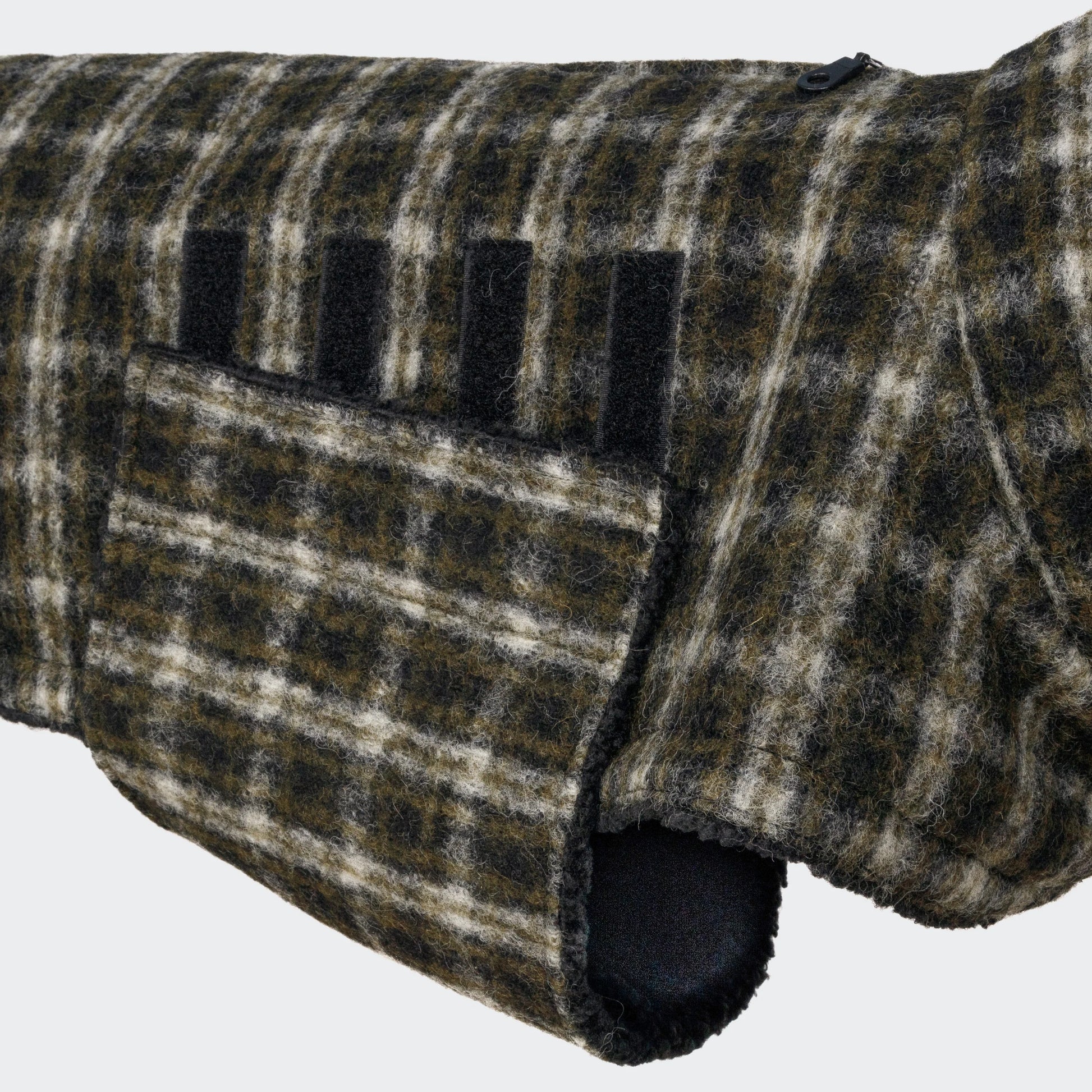 Ein Hunde Wintermantel mit bequemer Passform, mit wärmendem schwarzen Teddystoff gefüttert und vollendet mit einem stark wasserabweisenden, reißfesten Stoff im schottischen Karo Look in Grün-Schwarz.