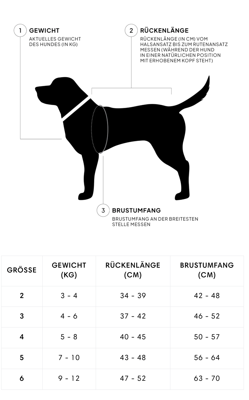 | Größe | Gewicht (KG) | Rückenlänge (CM) | Brustumfang (CM) |