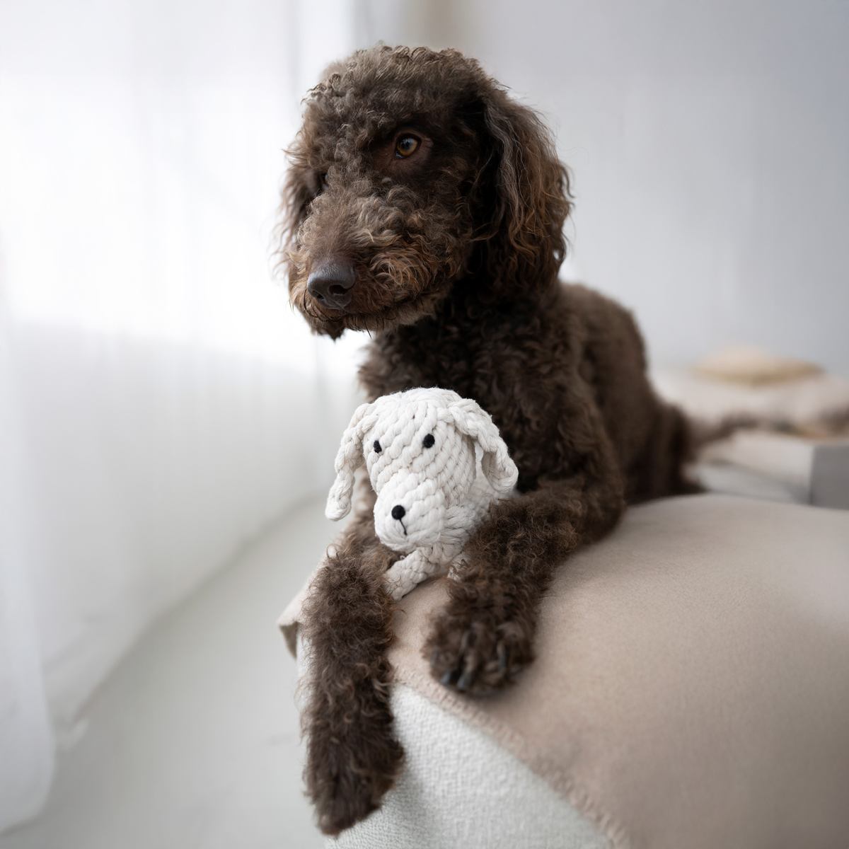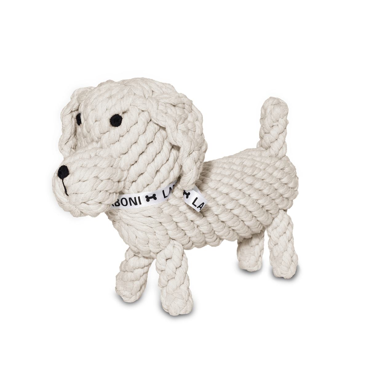 Richie ist der Gentleman unter den LABONI TOYS – charmant, sportlich und immer für ein Spielchen zu haben! Mit seinem muskulösen Körperbau, dem wachsamen Blick und den liebevoll geknüpften Schlappohren bringt Richie alles mit, was ein echter Retriever braucht: Apportierfreude, Bissfestigkeit und einen Herzschmelz-Faktor von 100 %. Ob für wilde Kauattacken, Wurfspiele im Garten oder entspannte Kuscheleinheiten – Richie macht alles mit. Dank seiner robusten Struktur liegt er angenehm in der Schnauze und bietet durch seine Größe auch mittelgroßen und großen Hunden den perfekten Spielpartner. Dabei sorgt er ganz nebenbei für saubere Zähne – denn die Baumwollfasern reinigen wie Zahnseide die Zahnzwischenräume.
