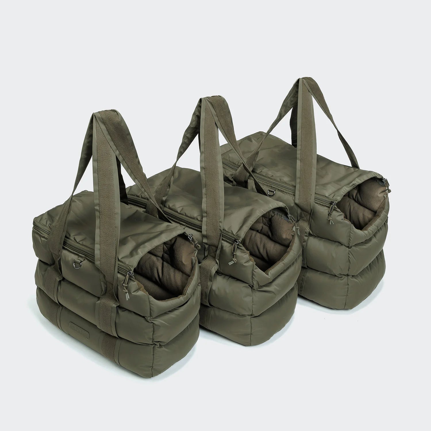 Grüne Hundetasche für kleine Hunde aus recycelten Materialien als mobiles Hundebett für unterwegs. Die gemütliche Hundetragetasche im Daunen-Look ist mühelos waschbar und mit besonders nachhaltigem Eco Puffer gefüttert.